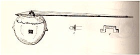 Earliest known sketch of an akonting, with details of string fixture and bridge shape. The neck appears to sit atop the soundplane with an uncertain method of securing it to the resonator, representing either a different construction method from contemporary akontings or a graphic error by Thomas. From Thomas 1959: Planche XXVL.
