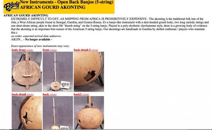 Left: Cover art for Banjo Journeys, album recorded by Florida-based banjoist and researcher Chuck Levy. Note that a smiling Senegambia is depicted dancing with several American states. Right: An akonting for sale at Elderly.com, a major folk instrument retailer.