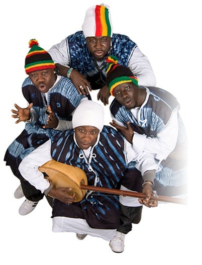 Left: The Akonting Center for Senegambia Folk Music in 2012. Musa Diatta and Daniel Jatta pose in front with local children. Right: Sana Ndiaye (center) plays a custom-made akonting with the hip hop group Gokh-Bi System.