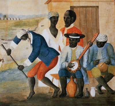 Left: Daniel Laemouahuma Jatta playing an akonting. Right: Detail from The Old Plantation, one of the earliest depictions of gourd banjos in the United States (circa 1790).