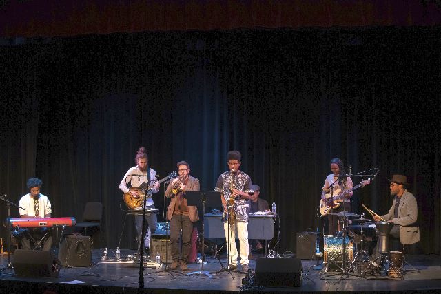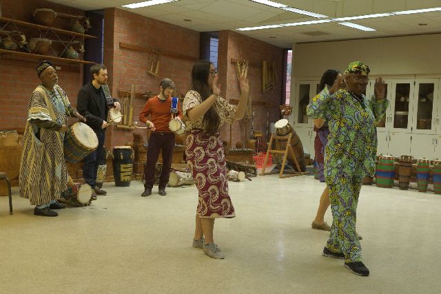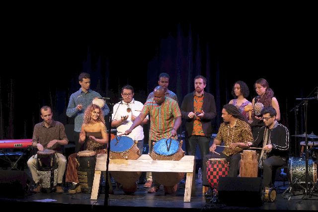 Members of the UCLA West African and Afro-Cuban Ensembles: Metebrafor Agindotan, David Castañeda, Juan Francisco Cristobal, Daniel Ferguson, William Matczynski, Marina Panzetta, Lorenzo Siciliano, Alfie Scott, Rachel Scott, Chloe Vaught, with special guest Francis Kofi Akotuah. Photo courtesy Brian Runt.