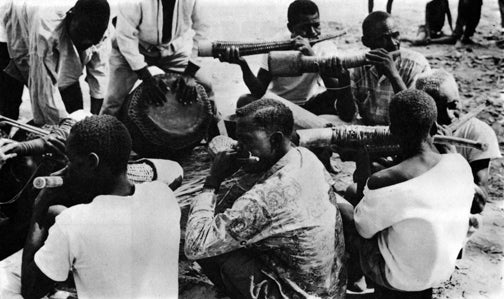 Figure 7: “Trompes et timbales de Mandonmbé” (Horns and drums from Mandombé). Bakongo masikulu musicians. Photo by Charles Duvelle from the liner notes to Congo: Musique Kongo: Ba Bembé, Ba-Congo, Ba-Congo-Nséké, Ba-Lari (1967). September 5, 1966.