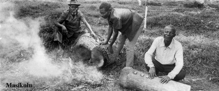 Figure 8: Masikulu drums. Photo by Benoit Quersin from the liner notes of Anthologie de la musique congolaise (RDC). Vol. 7. Musique des Kongo-Mbata (2006). 1974.