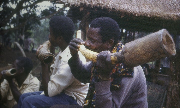 Figure 9: Mpungi horns in masikulu ensemble. Photo by Benoit Quersin from the cover of Anthologie de la Musique Congolaise (RDC). Vol. 7. Musique des Kongo-Mbata (2006). 1974.