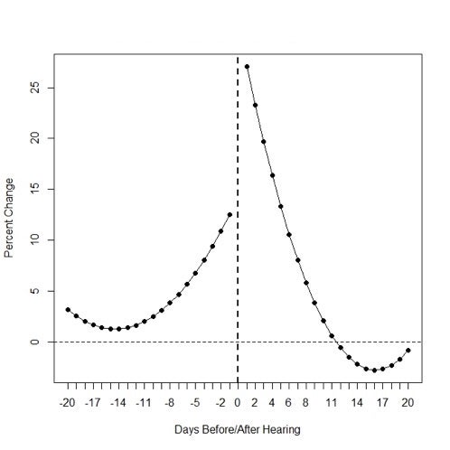 [16] Scholars have shown that persuasive political interventions have behavioral effects with a non-linear decay rate that approximates a quadratic process (see Lodge, Steenbergen, and Brau 1995). Following this convention, we model the page views variable as a quadratic function of time and a hearing indicator variable that differentiates the pre- from the post-period. We report the results of this analysis in our Replication Archive, which is available from the authors.