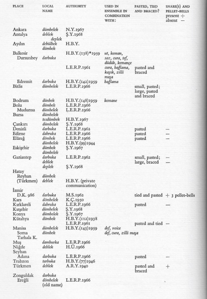 The handful of references to the term darbuka among other regional names recorded by Picken may be understood as the beginning of a gradual expansion of the use of the term to define goblet-shaped drums throughout Turkey. This is supported by the fact that each instance of the term darbuka used to describe a locally-made drum was recorded between 1959 and 1966, the last seven years of the forty-year period Picken examined. Moreover, the areas in which the term darbuka was used were often found to employ multiple names for the drum. Picken even writes the phrase “old name” next to the term dömbelek in Ereğli, while reporting the use of darbuka in the Zonguldak province within which Ereğli is situated, implying the replacement of one term by the other (Picken 1975:118). The gradual expansion of the application of the term darbuka from city-made metal drums to all varieties of the goblet-shaped drum appears to have parallels in the textual representations of the instrument.
